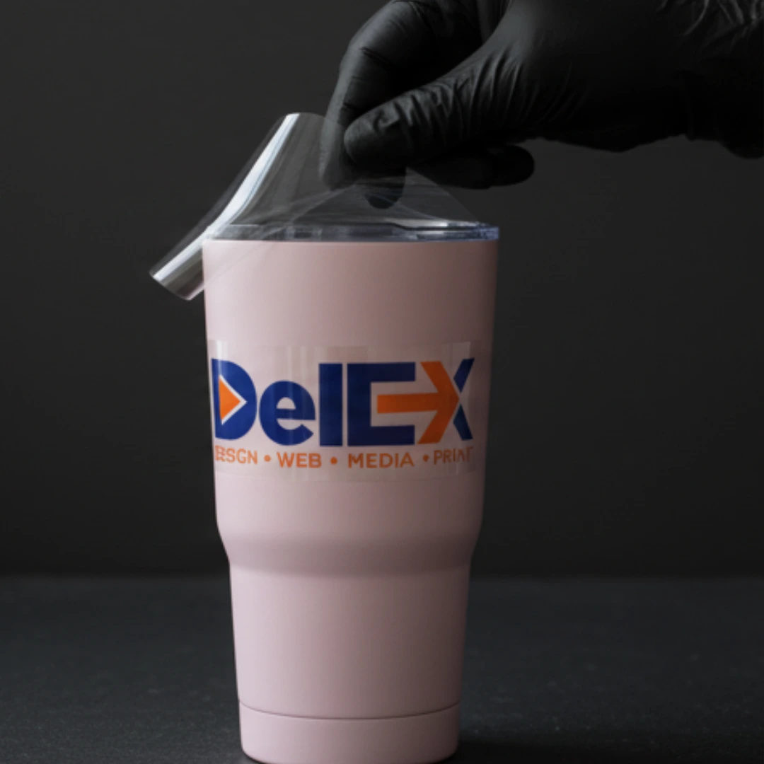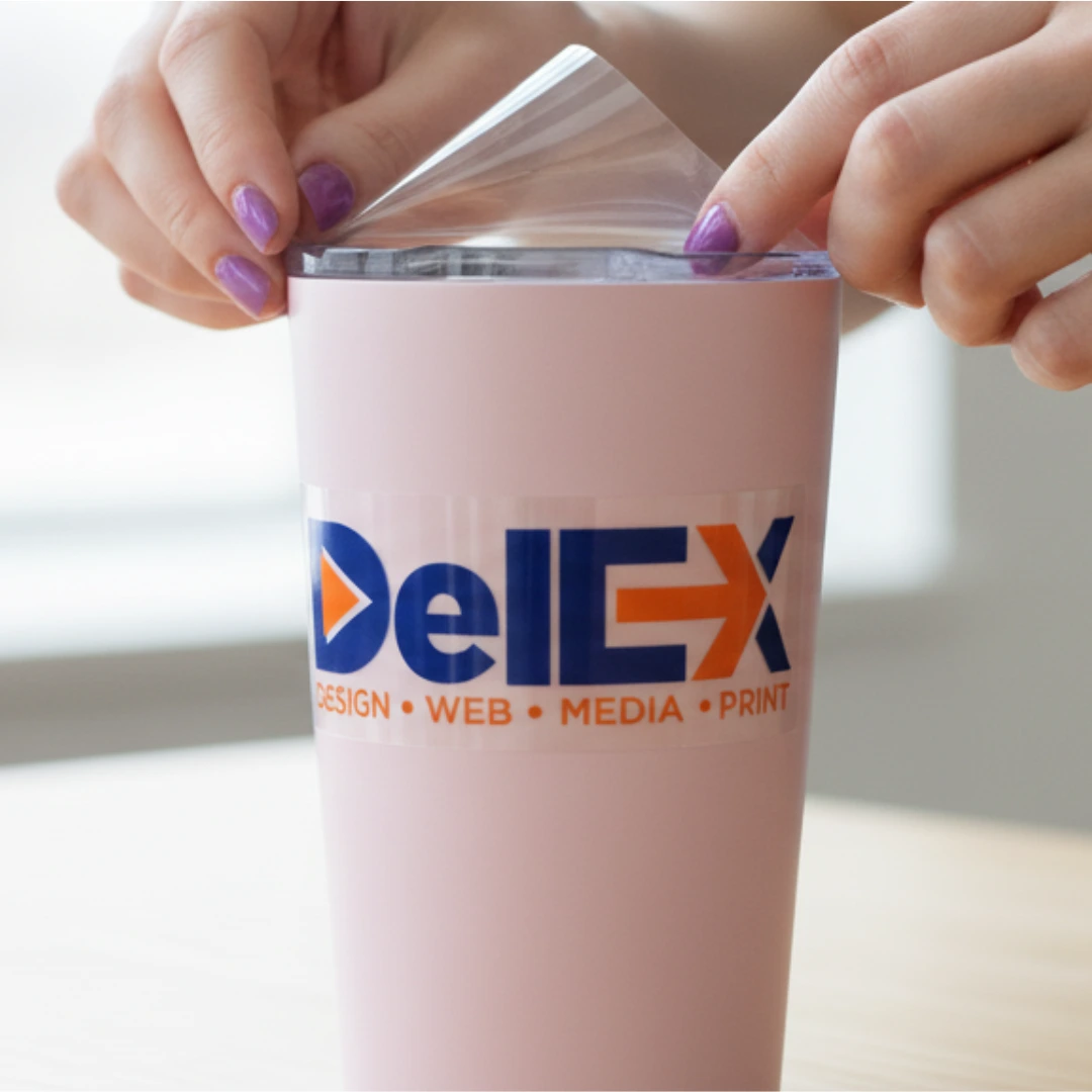 After applying, the carrier is removed, leaving the cured UV ink + adhesive bound to your surface.
